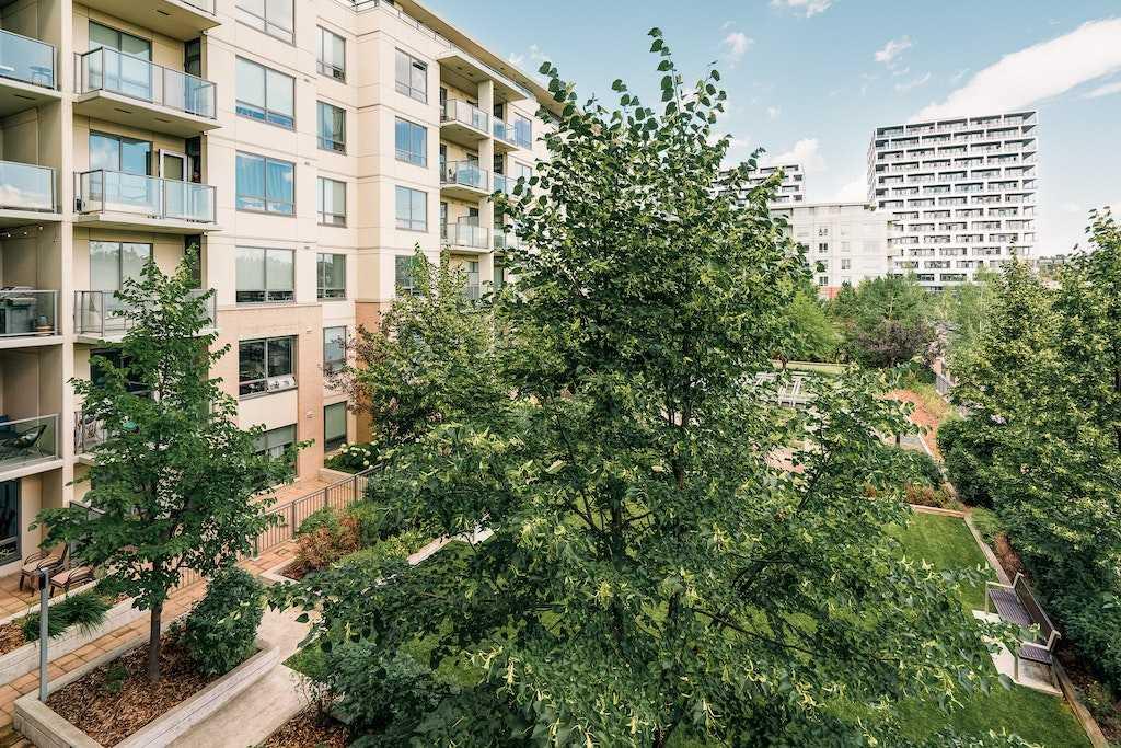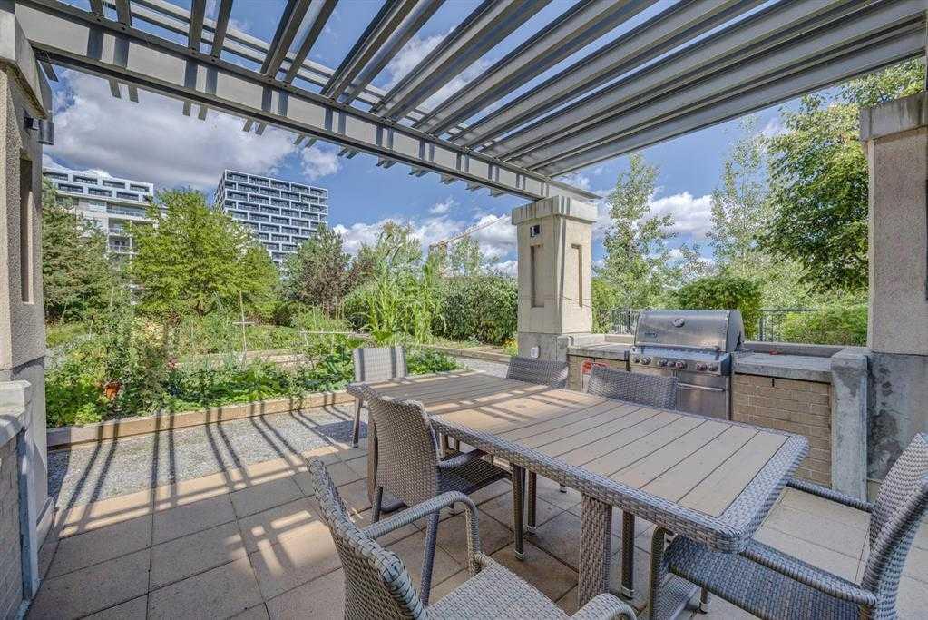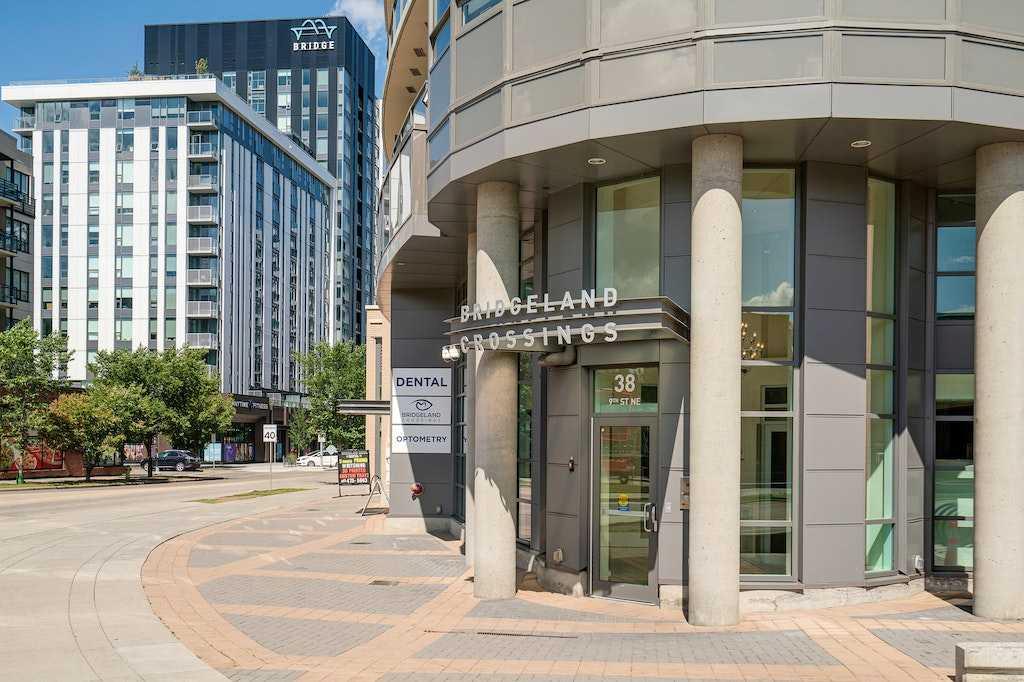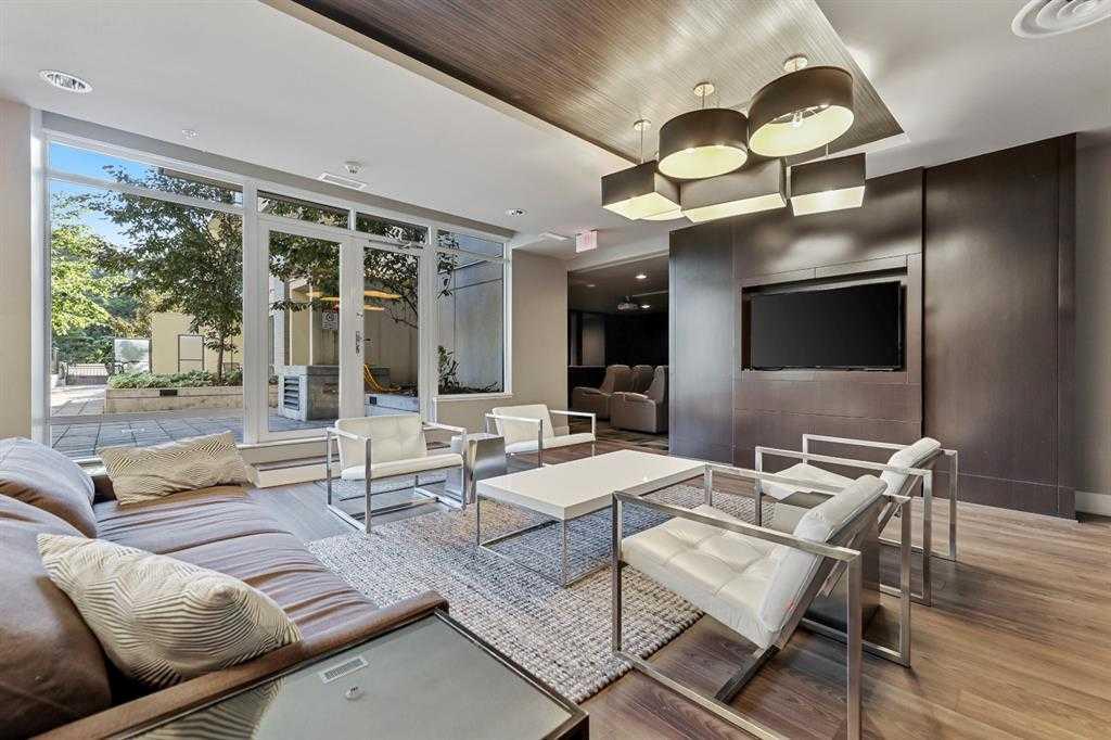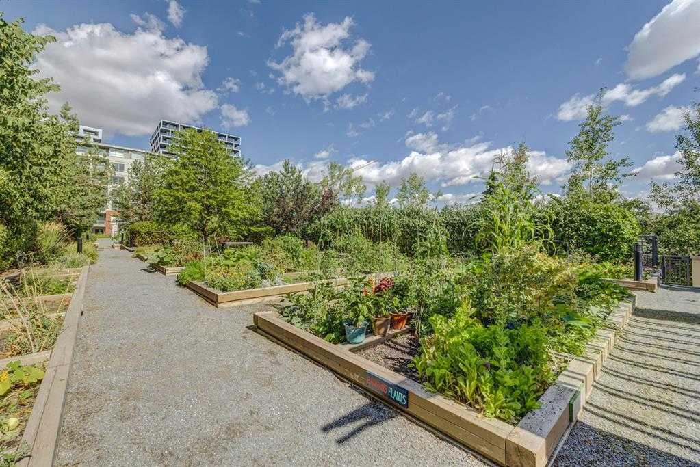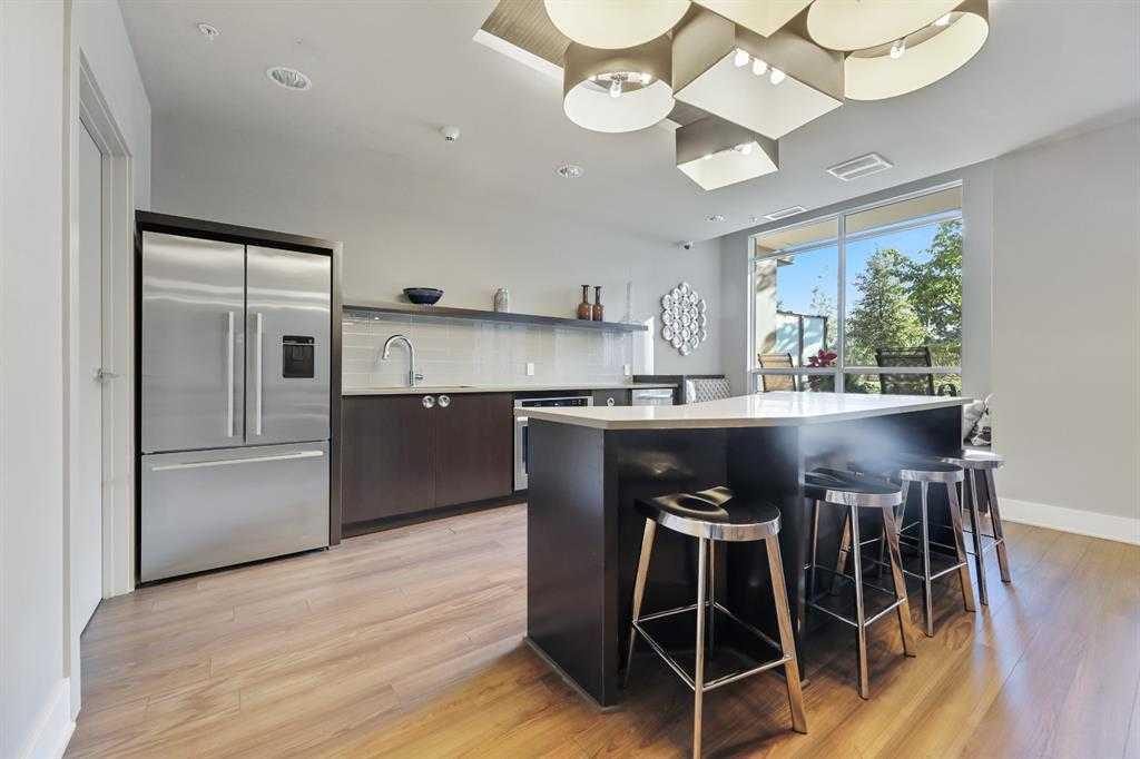 This trendy and enviable corner unit condo is ready to move in, located in the outstanding neighbourhood of Bridgeland! Illuminated in natural light, this unit boasts a stunning contemporary design with rich laminate flooring, high ceilings, neutral paint palette and wide open concept floor plan! Overlooking the living and dining spaces, the kitchen boasts premium stainless-steel appliances including a gas cooktop, that perfectly offsets sleek modern cabinetry, a substantial centre island with breakfast bar, large format tile backsplash and quartz countertops. The primary bedroom is spacious and boasts a walk-through closet and a modern ensuite bath with a glass enclosed corner shower, soaking tub, modern fixtures and matching cabinetry as well as a cheater door, so the bathroom can also be accessed by the main living areas. The generous second bedroom awaits, a multi functional space with built-ins, should you have company that would like to stay over or you prefer to have a separate at home office. Enjoy a glass of wine, or an alfresco dinner for two on the north facing balcony, the perfect place to wind down after a long day. Upgraded blinds, upgraded carpet, a separate storage locker and titled underground parking comes paired with an exceptional pet friendly building that includes plenty of amenities: fitness centre, social room, guest suite, garden plots, outdoor BBQs and a dog wash station. This incredible location is a short bike ride (or within walking distance) to downtown, and the many amenities of this popular community, shopping, restaurants, bakeries and ice cream shops, Murdoch and McDougall Parks, Bridgeland Riverside off leash areas, Tennis Courts, and so much more!
